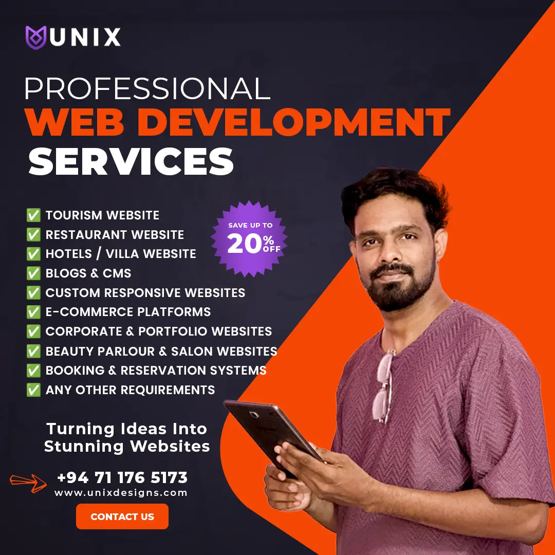 At Unix Designs, we turn ideas into impactful digital solutions. We are a passionate Web Development & Digital Marketing company based in Sri Lanka, dedicated to helping businesses grow in the online world.